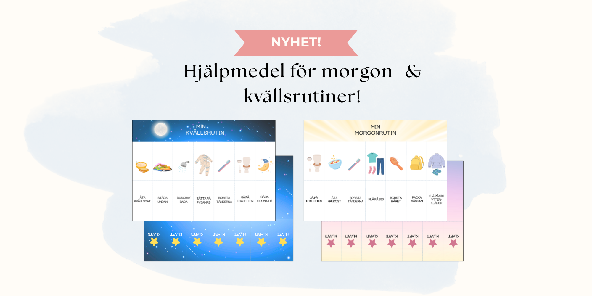 Min morgonrutin & Min kvällsrutin – två tydliga och lekfulla checklistor som hjälper barnet att känna sig självständigt och tryggt i vardagen.